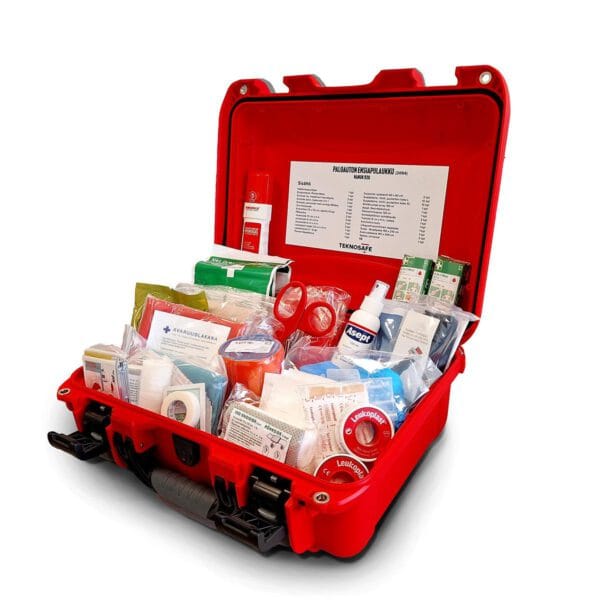 Hyvin varustettu ensiapulaukku paloautoihin. Laukkuna NANUK 920 -suojalaukku, joka on läpäisemätön (suojausluokitus IP67) ja rikkoutumaton, siinä on kevyt ja kestävä NK-7- hartsikuori sekä patentoitu Powerclaw-lukitusjärjestelmä. Ergonomisen kahvan ansiosta laukku on mukava kantaa, ja se pysyy pois tieltä, kun laukku ei ole käytössä.