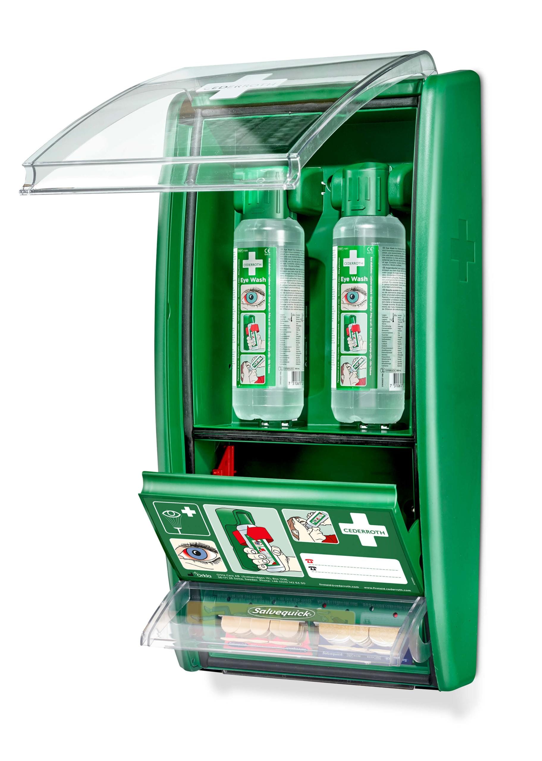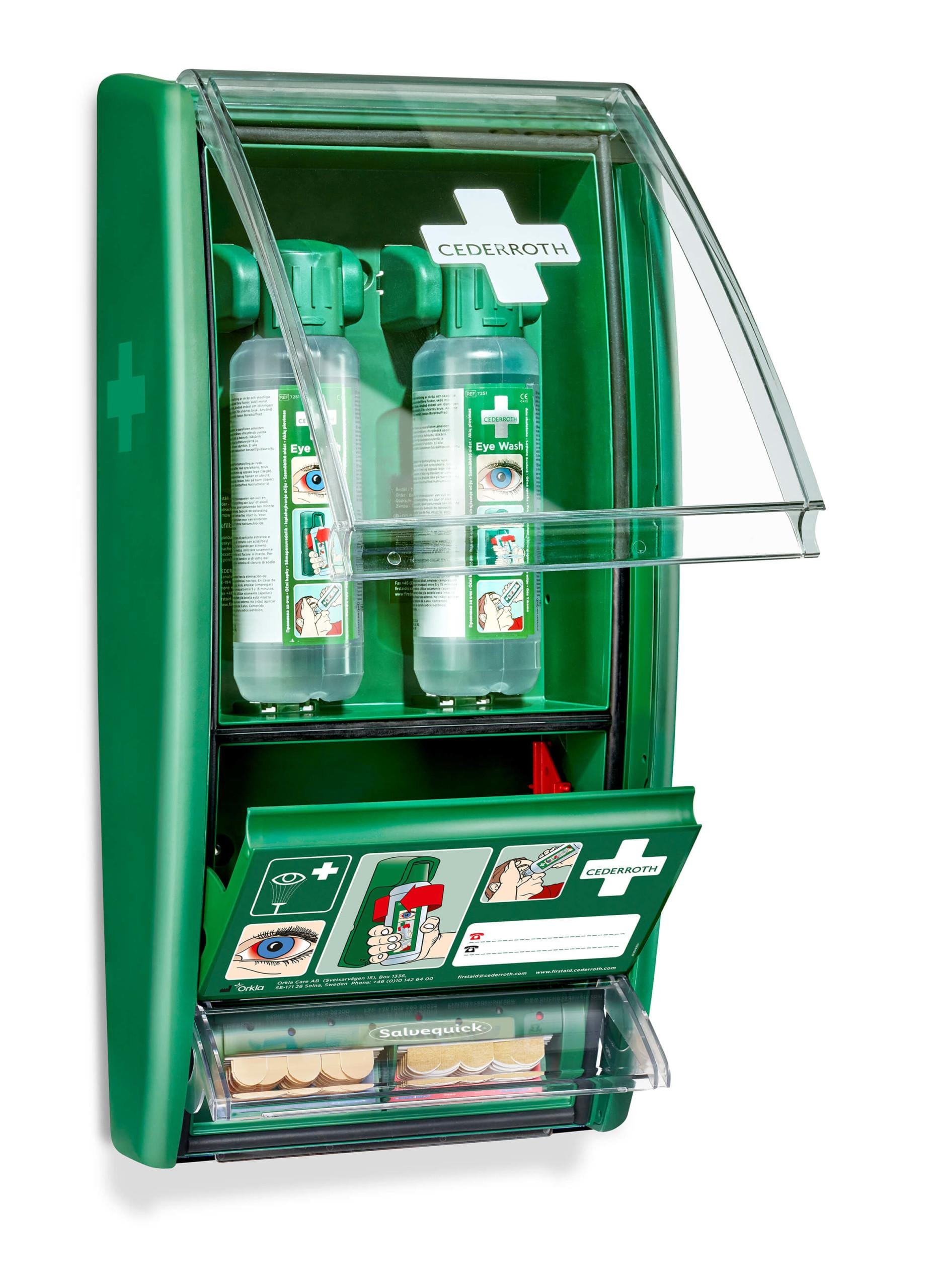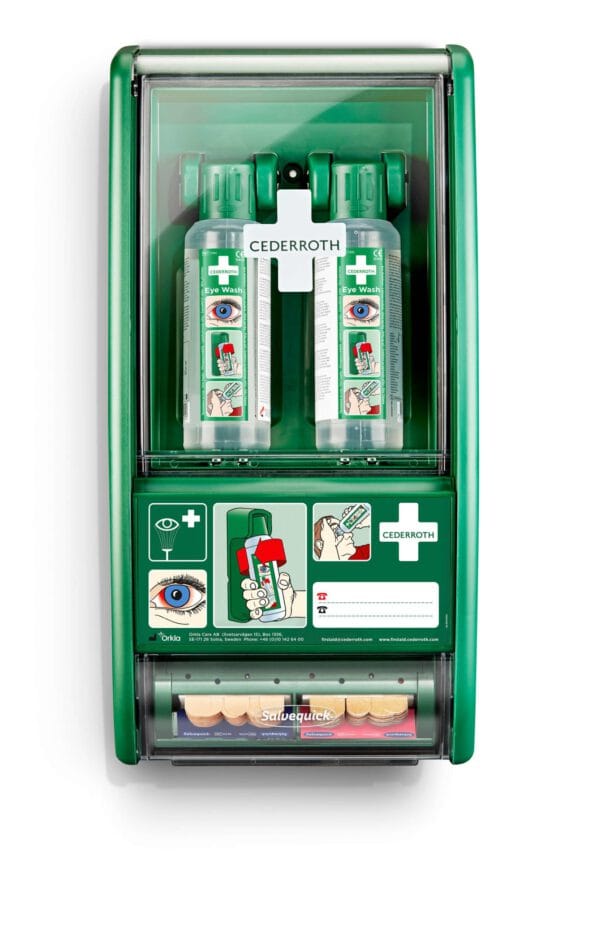 Asemassa on kaksi huuhtelupulloa, jotka avautuvat automaattisesti, kun ne kierretään irti telineestä. Pullon muotoilu mahdollistaa runsaan huuhtelun noin 1,5 minuutin ajan. 4,5 vuoden säilyvyysaika. Puskuroitu* huuhteluneste lisää mahdollisuuksia pelastaa silmät.