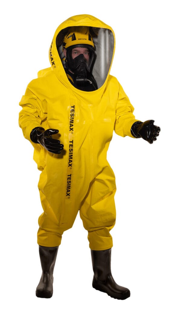 Kaasutiivis kemikaalisuojapuku sisäänrakennetulla visiirillä, käytettäväksi omavaraisen paineilmalaitteen kanssa.